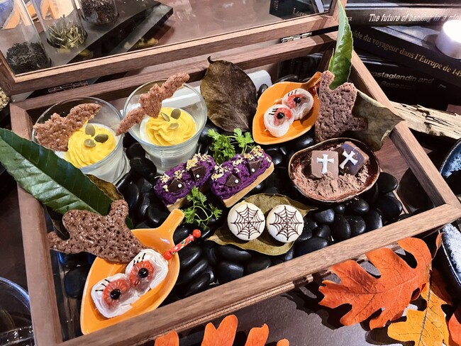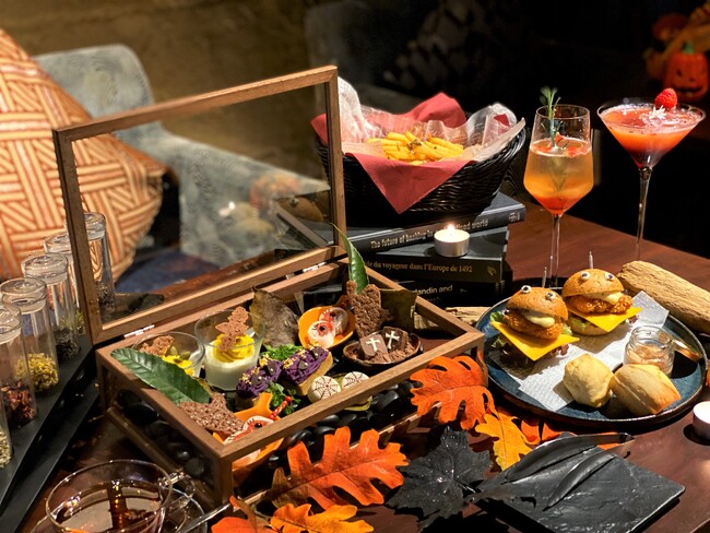 10月限定「ジュエルアフタヌーンティー宴」は秋の味覚を感じる「カボチャのブランマンジェ」や紫芋を使った「モンスターBOX」をはじめ、お化け目玉や蜘蛛の巣などこの時期ならではの遊び心あるラインナップでご用意しました。Instagramのキャンペーンに参加すると乾杯ハロウィンカクテルもプレゼントします。