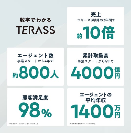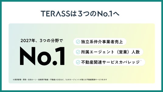 TERASSは今回の資金調達を基にさらに事業成長を加速させることにより、2027年を目標に、「独立系不動産仲介会社としての売上高」「不動産仲介営業職の人数規模」「不動産取引・資産形成関連サービスの充実度」の‶3つのNO.1”となることで、「いい不動産取引」を通じてお客さまをよりよい暮らしと資産形成に導くメインプレイヤーの地位を確立いたします。