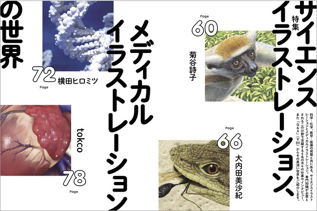 科学・化学、医学・医療の発展と共にある「サイエンスイラストレーション」と「メディカルイラストレーション」。専門知識が必要とされるこの分野で活躍する菊谷詩子さん、大内田美沙紀さん、横田ヒロミツさん(川崎医療福祉大学)、tokcoさん(株式会社LAIMAN)の作品はもちろん、これまでの歩みや制作背景などをお聞きしたインタビューから、その奥深い世界を垣間見ます。桜美林大学リベラルアーツ学群助教、株式会社LAIMANのコミュニケーション・アドバイザーである有賀雅奈さんに答えていただいた「Q&A」のコーナーも。