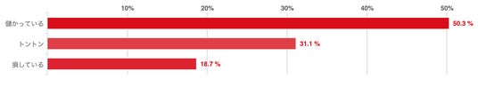 アンケートによれば、「儲かっている」と答えた投資家が50.3%で最も多く、「トントン」が31.1%、「損している」人が18.7%で最も少なくなった。