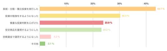 また、「投資の勉強をして知識をつけるようにした(30.3%)」や「慎重な投資判断を心がけた(23.9%)」、「値動きの安定している商品を中心に取引するようになった(23.2%)」といった回答も多数寄せられている。