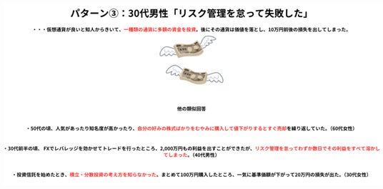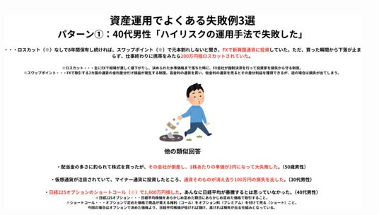 続いて、資産運用の失敗談や得られた教訓、失敗を防ぐコツに関するアンケート結果を取り上げる。