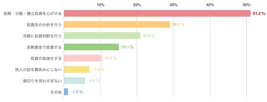 アンケートによれば、失敗したことがないと回答した投資家に失敗を防ぐコツを確認したところ、「長期・分散・積立投資を心がけている(51.2%)」という回答が圧倒的多数を占めた。