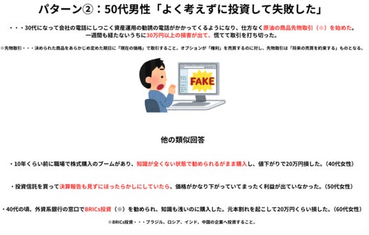 このように、「FXのロスカットで数百万円単位の損失を経験した」「情報がない状態で仮想通貨の取引を行い、数十万~数百万円の損害を被った」という回答が多くの投資家から寄せられた。