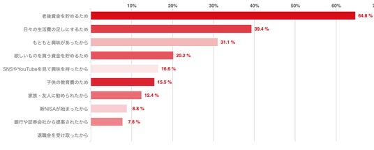 アンケートによれば、最も多かった理由は「老後資金を貯めるため」であり、回答者の64.8%から挙げられている。また、「日々の生活費の足しにするため(39.4%)」、「もともと投資に興味があった(31.1%)」といった理由も多く挙げられていた。