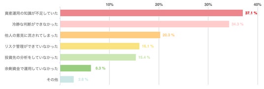 アンケートによれば、失敗の原因として主に挙げられたのは、「資産運用の知識が不足していた(37.1%)」と「冷静な判断ができなかった(34.3%)」の2点であった。