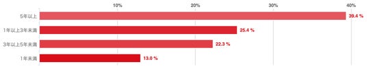 そこから「1年以上3年未満」が25.4%、「3年以上5年未満」が22.3%で続いており、「1年未満」の投資家は13.0%にとどまった。