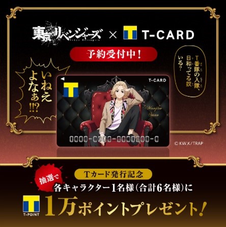 3月14日(月)~3月20日(日)までの期間、Tポイント公式(@tpoint)をフォローして、「#東リベのTカード +キャラクター名」を付けて引用ツイートした方の中から、抽選で各キャラクター1名様(合計6名様)にTポイント1万ポイントをプレゼント!