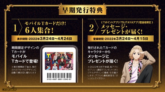 東京卍會6名の描き下ろしデザインのTカードは、3月14日(月)から予約受付、3月24日(木)から全国のTSUTAYA・旭屋書店にて店頭発行を開始します。(発行手数料:550円)