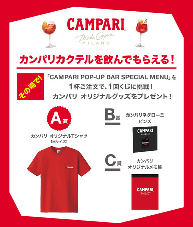 期間中、POP-UP BARでご提供するカンパリカクテルを1杯ご注文いただくと、1回くじをお引きいただけます。引いたくじに記載されているカンパリオリジナルグッズを、もれなく!その場で!プレゼントいたします。