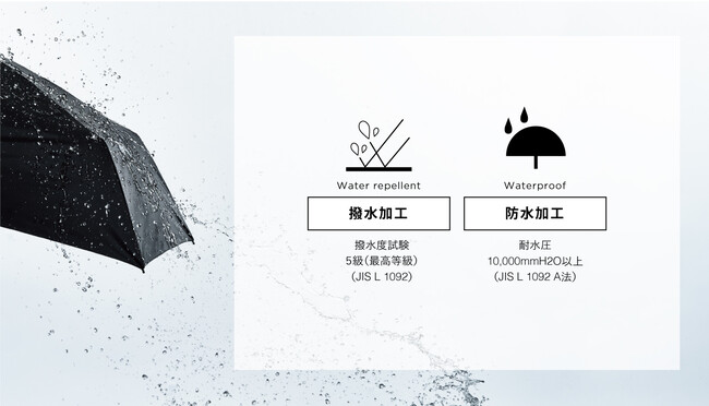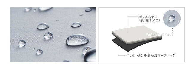 高い撥水力を持ち、撥水度試験では最高等級の5級を取得。雨粒と生地の接触する面積が減ることで水滴が転がりやすくなり、雨の日のストレスを軽減します。さらに生地裏面にポリウレタン樹脂多層コーティング加工を施すことで防水性も高めています。