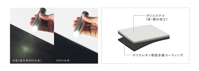 UVカット率・遮光率は全色100%生地を使用しており、紫外線防止指数を表すUPFは最高値の50+を記録。また生地裏面にポリウレタン樹脂多層コーティング加工を施しているので遮熱効果があり、紫外線も熱もしっかりカットします。