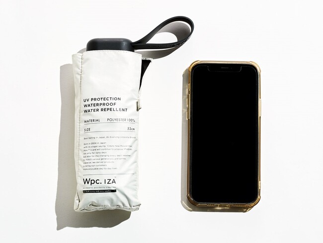 ZAシリーズのなかで一番人気は「COMPACT(コンパクト)」。縦17cm×横6.5cmでスマートフォン(画像:iPhone12)と同じサイズ感です。また折りたたみ傘では珍しいスクエア型なので、バッグものシルエットを崩さず収納できます。