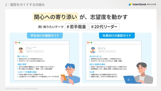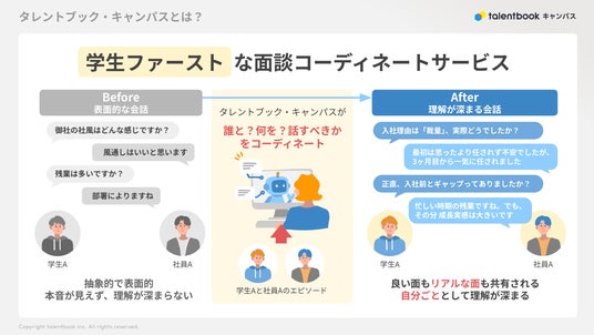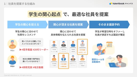「ロールモデル」を起点にAI時代の新しい採用体験をつくるタレントブックシリーズを展開するtalentbook株式会社(本社:東京都渋谷区、共同代表取締役:大堀航/大堀海、以下「当社」)は、学生の志望度を動かす面談コーディネートサービス「タレントブック・キャンパス」の先行案内を2026年4月24日より開始します。