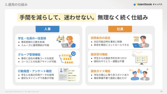 学生・社員の一括登録によって人事の工数を削減し、スムーズな運用開始が可能。募集コースの設定や、コースごとの社員アサイン、さらに行動履歴やアンケートなど学生と社員の利用データを取得することで適切なタイミングで改善が可能となります。社員においては対応可能日時など訪問条件を設定することで負担を事前にコントロールでき、面談受付機能によって、個別のやりとり・調整は不要となります。面談ガイド機能により、事前準備不要で面談に臨むだけです。