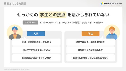 talentbookはサービス開始以来、社員のロールモデルを通じて企業の魅力を伝える採用広報サービスを提供してきました。累計1,200社・年間約300万人が訪問するプラットフォームとして成長する中で、採用現場から聞こえてきたのは「せっかくの学生との接点を活かしきれていない」という課題です。インターンシップフォロー・OB/OG訪問・内定者面談など、学生との接点は確かに増えています。しかし、人事担当者・学生の双方から、共通した課題が長年放置されてきました。