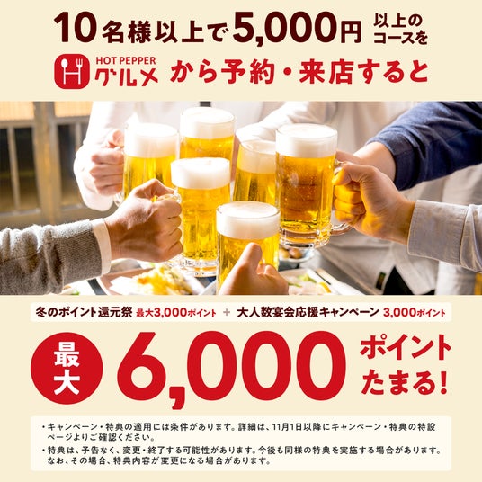冬のポイント還元祭と大人数宴会応援キャンペーン合わせて10名以上、5000円以上のコースをご予約いただくと最大6000ポイントGETのチャンス!この機会にお得に食事を楽しもう。