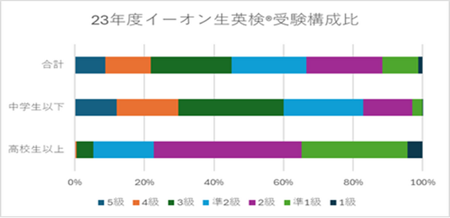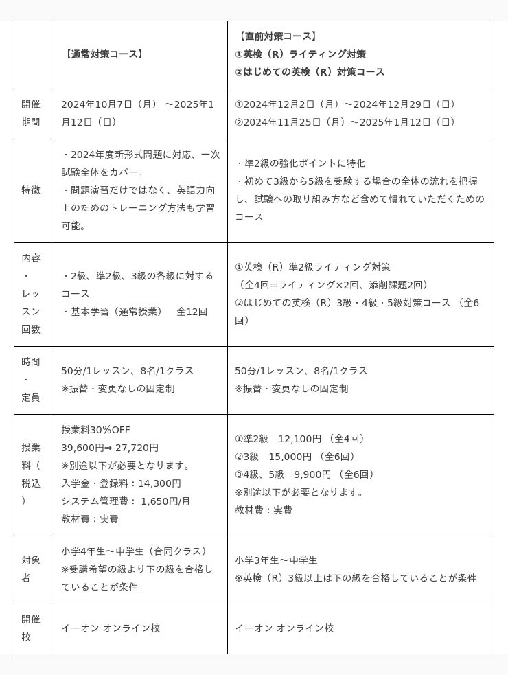 イーオンの生徒さまも23年度に延べ約1万人の方が、英検(R)を受験されました。中学生以下のお子さまの6割が、3級から5級を受験し、高校生以上の9割を超える方が1級から準2級までを受験しています。英検(R)対策コースはこれまでも開催してきましたが、生徒さまの声を伺い、基本学習と特にご希望の多いライティングの強化を目的としたクラスをこの度設定することといたしました。一方、英検(R)を初めて受験されるお子さまに向けては、全体の流れを把握し、試験への取り組み方などに慣れていただくためのクラスを設定しました。