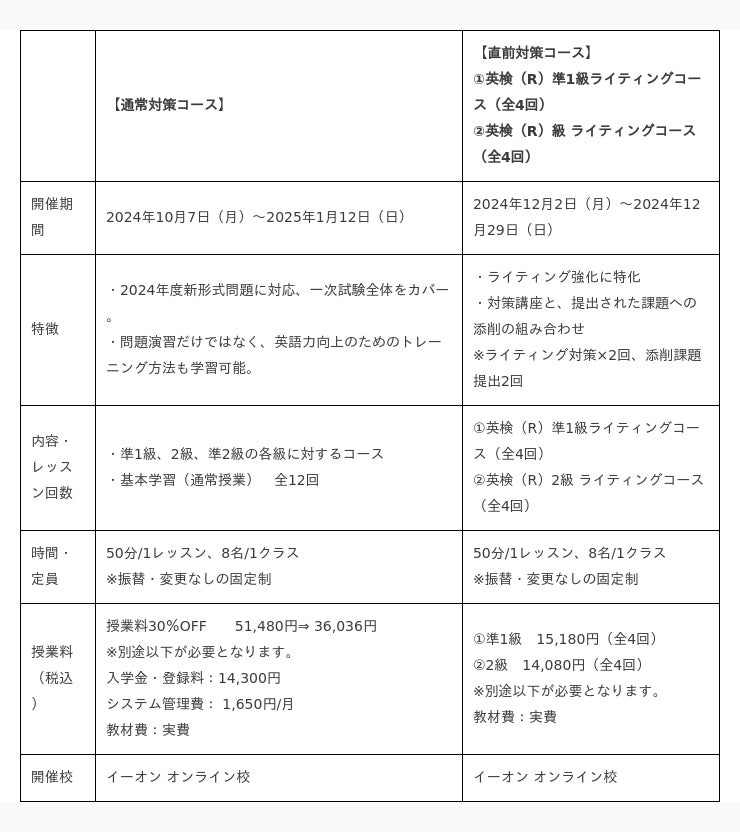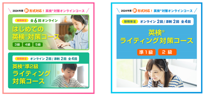 2024年10月7日より開始している基本学習を行う「英検(R)通常対策コース(全12回)」に加え、新たに始まる「英検(R)直前対策コース」ではライティングに特化するなど、英検(R)合格に向けた強化コースとなります。さらに、キッズクラスには英検(R)に初めて挑戦するお子さま向けのコースもご用意しています。