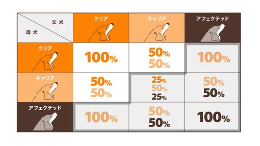 この疾患は常染色体潜性遺伝により発症します。両親から変異遺伝子を受け継いだ犬(アフェクテッド)が発症する可能性が最も高く、片親のみから受け継いだ犬(キャリア)は発症しませんが、次世代に変異遺伝子を引き継いでいく可能性があります。