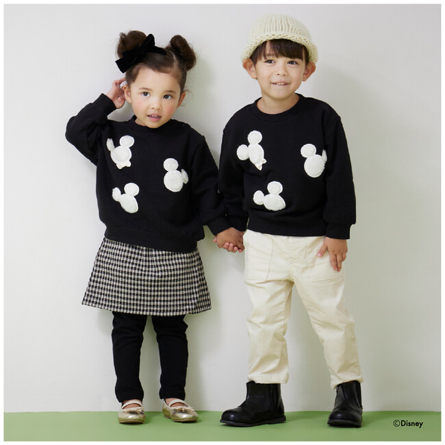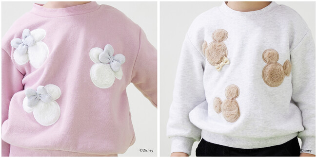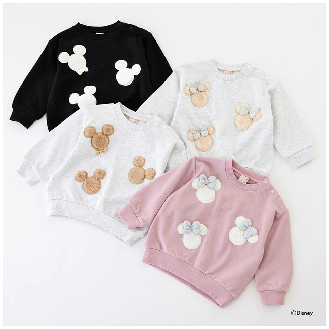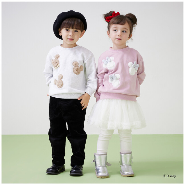 キッズの大好きなミッキーマウス・ミニーマウスのモチーフに、ファーやキラキラなど季節感のある素材を使用した特別感のあるプティマインらしいデザイン。デイリーに着やすいトレーナーでご用意しました。