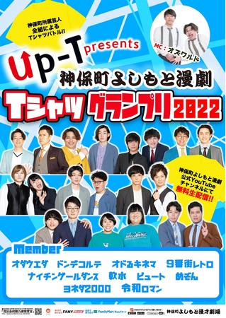 丸井織物が運営する、1枚からつくれるオリジナルグッズ制作サイト「Up-T」にて、2022年1月11日(火)~4月9日(土)の期間中、神保町よしもと漫才劇場所属の芸人がデザインしたオリジナルTシャツの販売をリアルタイムで競う企画となっており、Up-T始まって以来最高人数での超大型バトルとなっております。