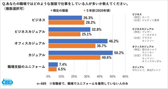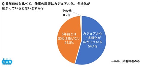 ・約半数が5年前と比べて職場の服装の「カジュアル化・多様化が広がっている」と回答。