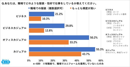 ・職場で仕事をしているときの服装で最も頻度が高いのは「カジュアル」スタイルが約4割。「オフィスカジュアル」「ビジネスカジュアル」と合わせて、カジュアル系が約9割を占める。