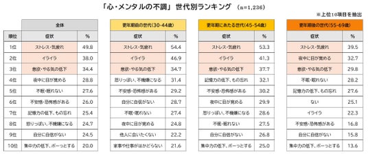 ●症状は更年期前・更年期にあたる世代は「ストレス・気疲れ」「イライラ」が上位に