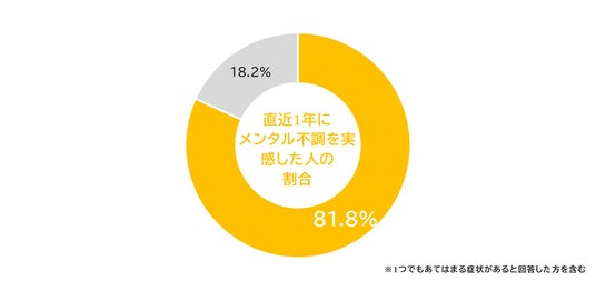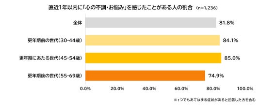 30代~60代の女性1,236名に、直近1年以内感じた「心の不調・お悩み」(※1)について尋ねたところ、30代~60代の女性の全体の81.8%が何らかのメンタルの不調を感じたことがあると回答しました。
