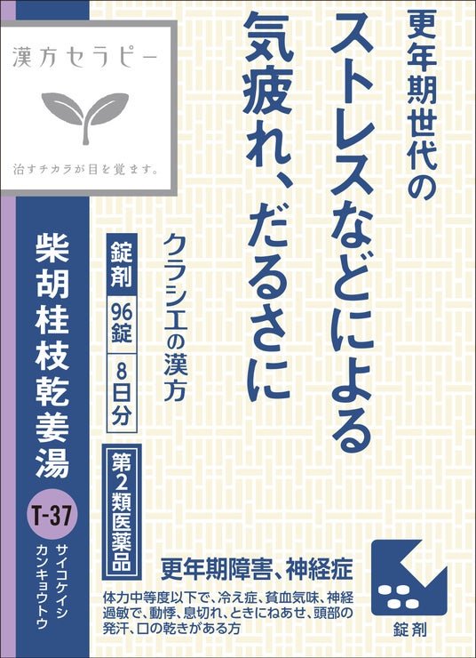 効能:体力中等度以下で、冷え症、貧血気味、神経過敏で、動悸、息切れ、ときにねあせ、頭部の発汗、口の乾きがあるものの次の諸症:更年期障害、血の道症、不眠症、神経症、動悸、息切れ、かぜの後期の症状、気管支炎
