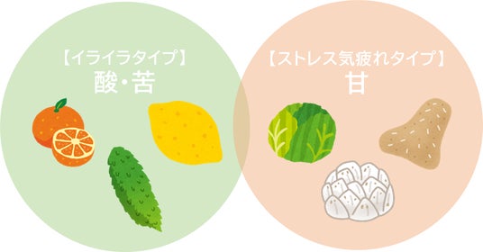 ストレスによる気疲れやだるさを感じる方は「血」が不足または滞っている傾向があります。このタイプの人は「血」の巡りをサポートするたまねぎや青魚を摂ることをおすすめします。また、胃腸の状態が悪いと「血」が不足するため、筋肉の緊張をゆるめ、胃腸の働きを助けるキャベツやゆり根、やまいもなどの自然の甘味がある野菜を摂っていきましょう。