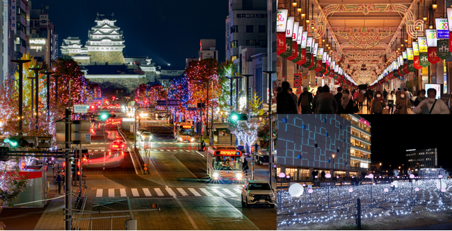 姫路市は来る大阪・関西万博等におけるインバウンド需要の獲得に向け、JR姫路駅から世界文化遺産姫路城まで続く大手前通りを上質なイルミネーションで華やかに彩る「Himeji大手前通りイルミネーション」を実施し夜のほこみちを活用したまちなかのにぎわいや出会いの場の創出に官民一体となって取り組むことで、観光客への“おもてなし”や市民にとっての“誇れる城下(まち)”を目指しています。