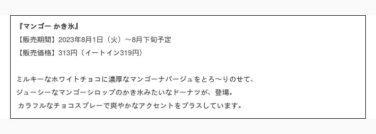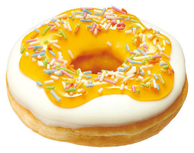 『マンゴー かき氷』は、ジューシーなマンゴーシロップのかき氷をイメージしたドーナツです。ふわふわのリングドーナツにミルキーなホワイトチョコをコーティングし、濃厚なマンゴーナパージュをとろっとのせました。仕上げにカラフルなチョコスプレーをトッピングし、華やかさをプラス。楽しい夏をさらに盛り上げる一品に仕上げています。
