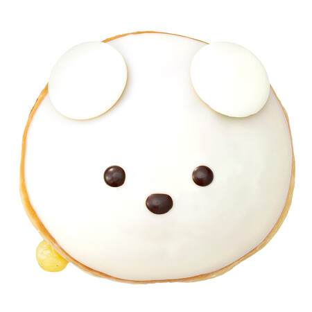 2020年に登場し、ご好評いただいた『シロクマ カスタード』が表情を変えて帰ってきました。ひんやりと涼しげなイメージのシロクマをモチーフにしたドーナツは、ふわふわの生地にホワイトチョコをコーティングし、北海道産のミルクを使用した優しい甘さのカスタードクリームを中に詰めています。つぶらな瞳と鼻はビターチョコで描き、パリッとした食感のホワイトチョコでキュートな丸い耳を表現しています。