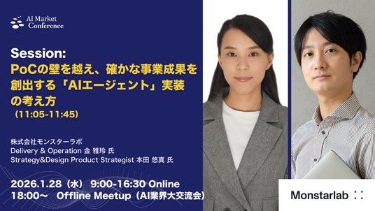 最適なAI会社やAIサービスの選定を支援するコンシェルジュサービス「AI Market」を運営するBizTech株式会社(東京都豊島区、代表取締役 森下 佳宏)が主催する、1月28日開催の国内最大級AIカンファレンス『AI Market Conference 2026』に登壇する株式会社モンスターラボ 金 雅玲氏、本田 悠真氏の講演内容をお知らせ致します。