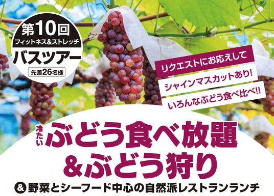 株式会社いーふらん(本社:神奈川県横浜市、代表取締役社長 鹿村大志、以下いーふらん)は、いーふらんが展開する「フィットネス&ストレッチ 健康の森」事業において、運動を通じた健康促進のみではなく、体験を通じたこころの充足、人と人とのつながりを「遊びながら」創出する会員限定バスツアーにおいて、9月は「冷たいぶどう食べ放題&ぶどう狩りツアー」の開催を実施することをお知らせいたします。