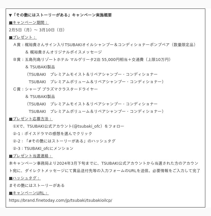 またTSUBAKIの製品と共に、梶さんのオリジナルボイスメッセージが届く「その艶にはストーリーがある」キャンペーンもスタート。