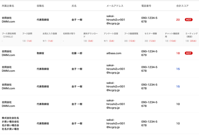 出展社への関与・関心度に応じてスコアを設定。その合計値を集計・一覧化し、営業優先度が高いと推測されるHOTリードに対して優先的にアプローチすることができます。