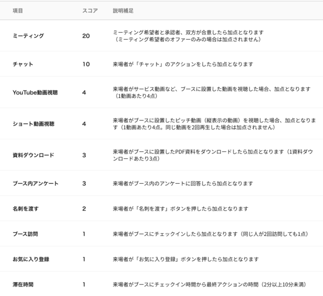 出展社ブースを訪れた各ユーザーのアクション履歴情報を数値化したものです。