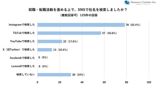 「転職活動の際、SNSで社名を検索しましたか?」という質問に対し、約8割の求職者が何かしらのSNSで「検索をした」と回答しました。内訳は、Instagramが62.4%、TikTokが45.6%となっています。
