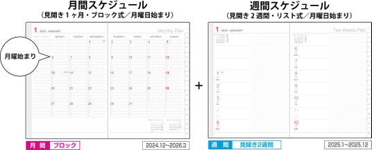 - 月間スケジュールと見開き2週間の週間スケジュールをまとめた1冊