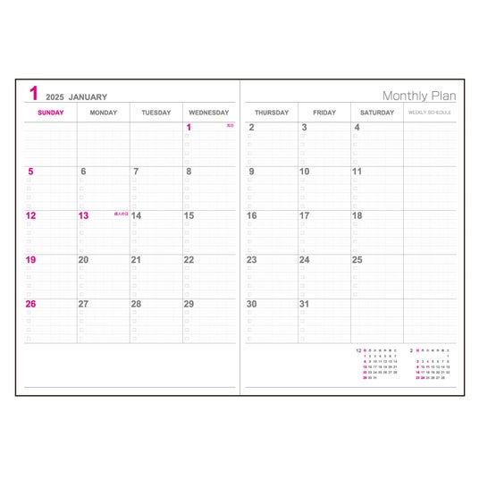 定番の「ロジカルダイアリー 月間ノートタイプ」のマンスリーページはカレンダーと同じ日曜日始まりで、デスク用や2冊目の手帳として最適です。また、1ページあたり31行24マス構成のノートページを収録しているので、1日1行を使って1か月の予定を組むことや、一行日記など自由な使い方ができます。