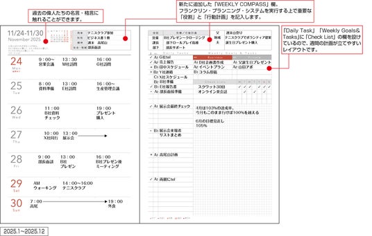 - 左のページに1週間分のダイアリー、右のページにタスクや目標のチェックリストがあり、週間計画を立てやすいレイアウト
