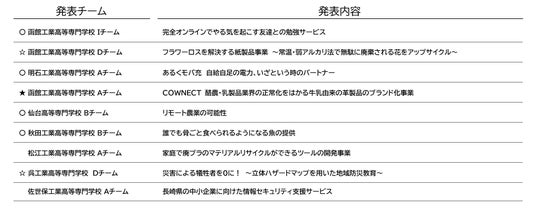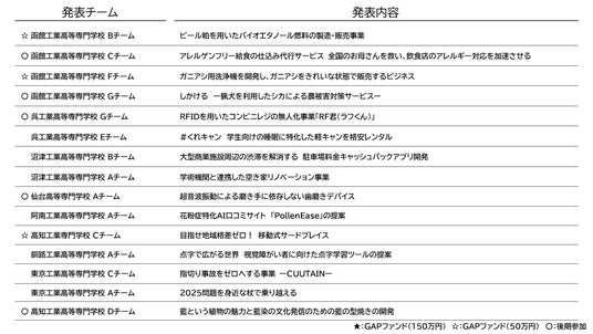 ワークショップ形式のレクチャーを行う前期ワークショッププログラム(以下、前期)は、広島商船高等専門学校での高専間提供科目として開講しました。前期では高専生でチームを組成し、事業アイデアを作り上げました。最終日にはビジネスプラン発表会でプレゼンテーションを実施し、VCや起業家からフィードバックを受けました。その発表会の結果、後期PoCプログラムにて、GAPファンドから資金提供を受ける6チームが決定したことをお知らせします。