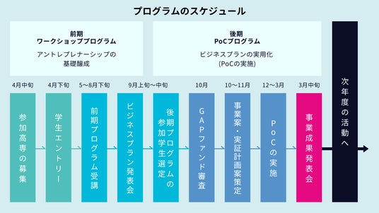 参加者する高専生が構築した事業アイデアは、前期で実施される発表会でステージゲート審査を突破すると、後期のPoCプログラム(以下、後期)で実証実験に活用できるGAPファンドを獲得することができます。後期の参加者は、前期に引き続き事業開発の知識をもつメンターによるメンタリング及びプロトタイピングなどの支援を受けることができます。