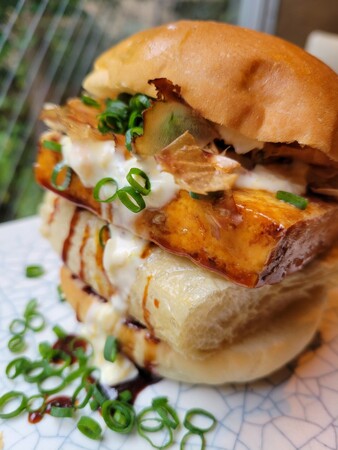 その大豆の旨味が凝縮された「にし阿波」特有のお豆腐を、豪快にバンズに挟みこんだ歩危バーガーです。
