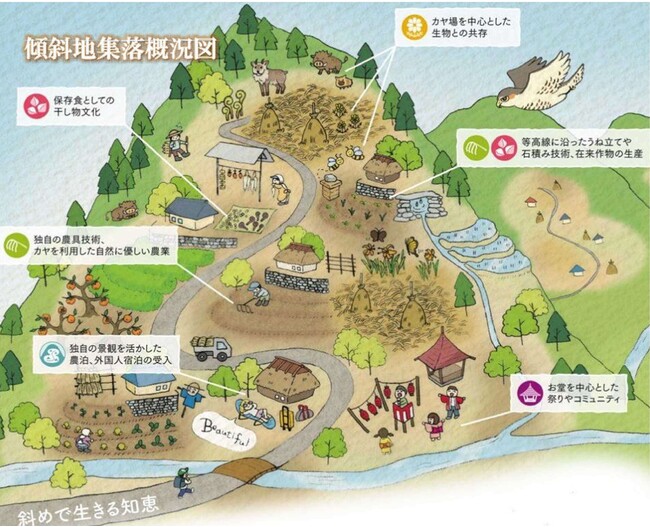 これらの地域では傾斜地のまま農耕を行なっており、独自の技や知恵を培って、自然を守り、生命を守り、集落を守ってきたのです。この400年以上にわたり継承されてきた山村景観や食文化、そして農耕にまつわる伝統行事などの全てが「傾斜地農耕システム」です。