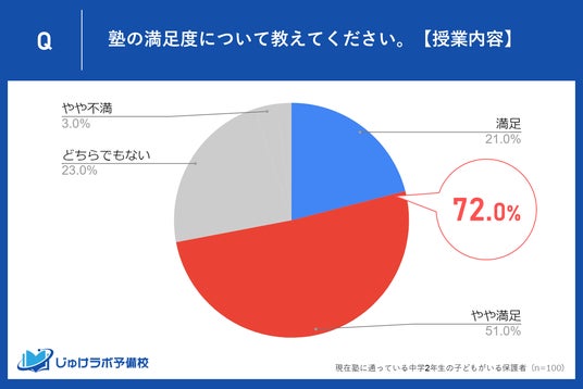 授業内容に対しては21%が「満足」、51%が「やや満足」と回答し、72%の保護者が高評価をしています。授業内容が充実していることは、子供の学習意欲を高め、成績向上に繋がる重要な要素になります。