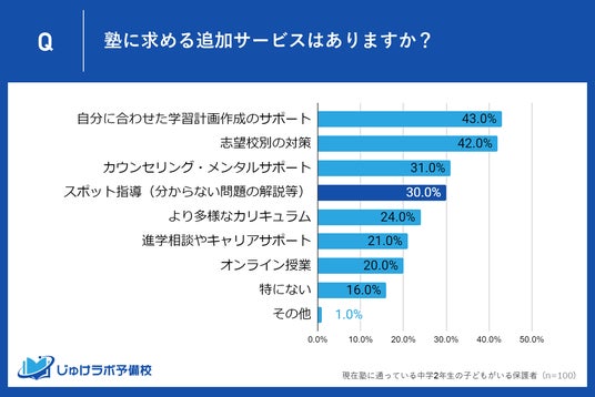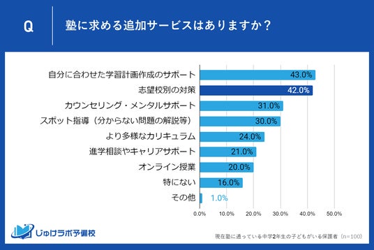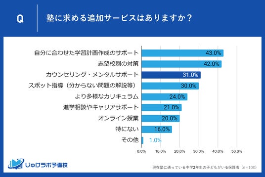 保護者が塾に求める追加サービスとして、「自分に合わせた学習計画作成のサポート」や「志望校別の対策」、「カウンセリング・メンタルサポート」などが挙げられました。